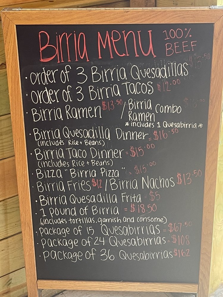 Birria pizza made with big flour tortilla that is dipped in consomme, filled with cheese, onion, cilantro and birria. Includes one 12 oz. consome. This is topped with sour cream and avocado salsa which can be a bit spicy.